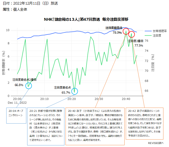 12月11日に放送された第47回「ある朝敵、ある演説」は、視聴者にどのように見られていたのでしょうか? テレビの視聴者の様子を、1分毎の「REVISIO推定視聴率」と、「テレビの前にいる人のうち、テレビ画面に視線を向けていた人の割合=注目度※」のグラフで見てみました。