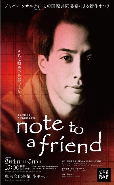 デヴィッド・ラングは『note to a friend』を手掛けるにあたり、芥川龍之介の『或旧友へ送る手記』『点鬼簿』をベースにしています。「芥川龍之介の作品は、映画『羅生門』を通して知り、10代の頃に読んでいた」というデヴィッドは、「日本との懸け橋という意味でも、これはぴったりかもしれないと思った」と言います。
