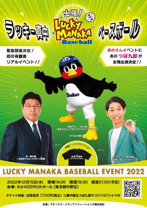 ラオックス・メディアソリューションズ株式会社(本社:東京都文京区)主催のオンライン配信トーク『ラッキー真中ベースボール』(~2023年2月まで絶賛配信中)は、その初の有観客イベントを12月15日(木)「なかのZERO大ホール」にて開催します。配信と同様、MCを真中満、アシスタントにスカチャンの宮本和幸が務め、特別ゲストに東京ヤクルトスワローズマスコットキャラクターのつば九郎を迎えます。