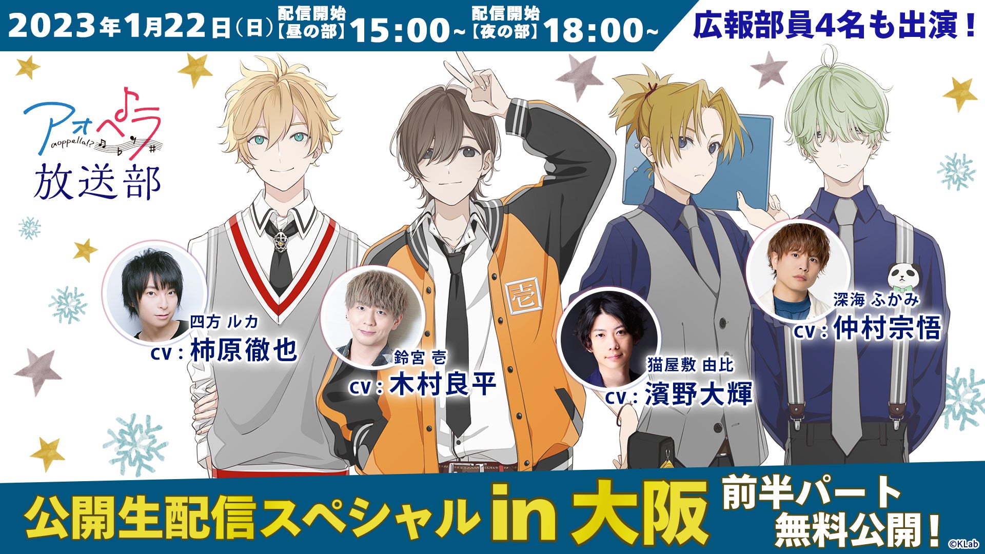 2023年1月22日(日)に、大阪COOL JAPAN PARK OSAKA WWホールで「アオペラ-aoppella!?-放送部 公開生配信スペシャルin大阪」を開催します。