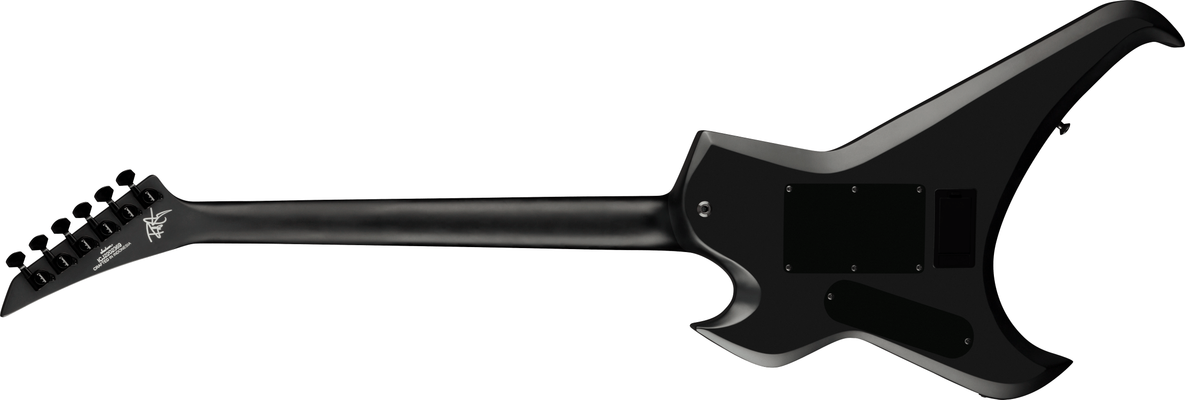 - ブラックハードウェア、ブラックネック&ヘッドバインディング、ブラックニッケルのJacksonロゴがエンボスされた先鋭スタイリングの6連ペグ式ブラックヘッドストックサテンブラックフィニッシュ