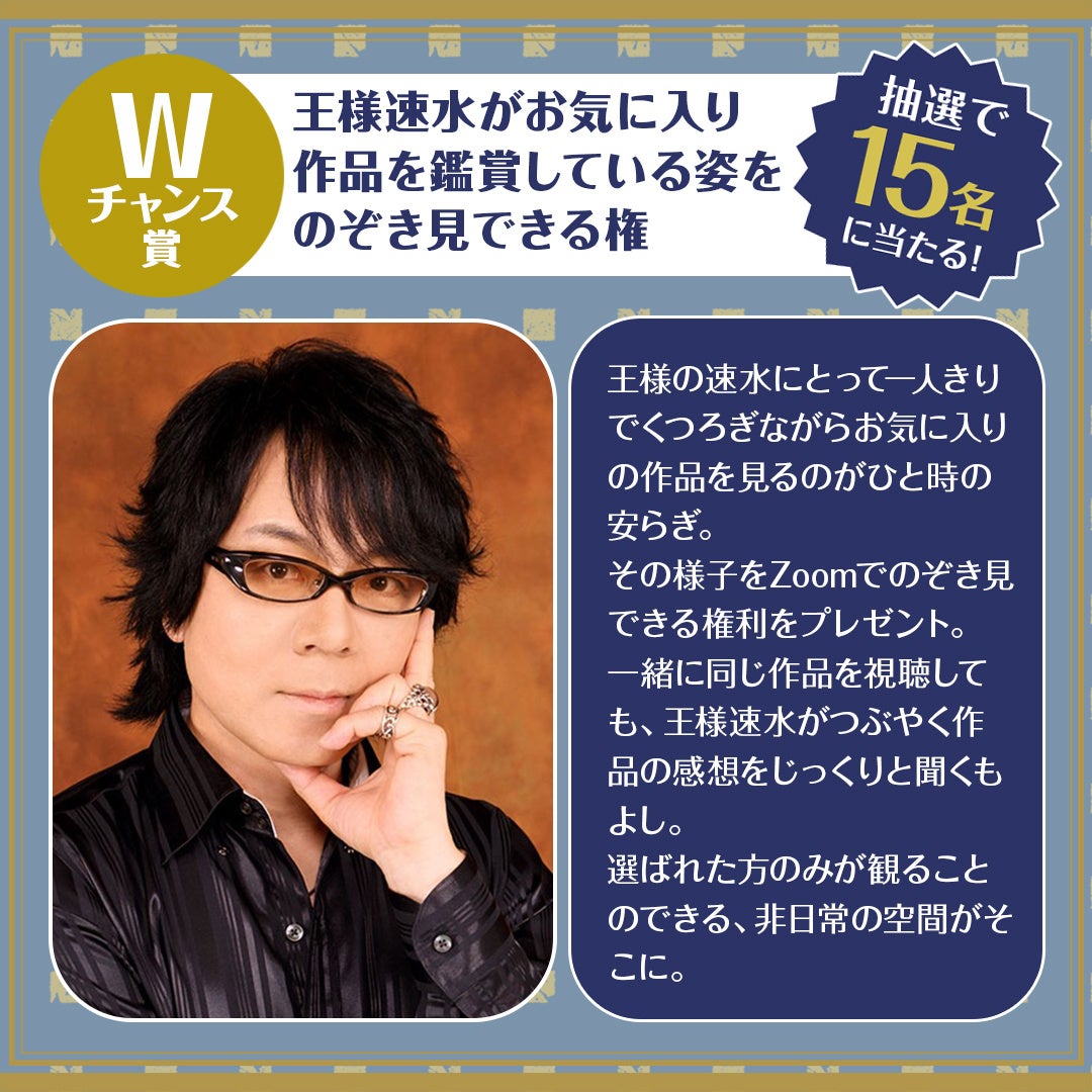 またWチャンス賞として、本くじメイトを購入した人の中から抽選で15名に、王様である速水奨さんがお気に入り作品を観ている様子を、オンライン会議サービス「Zoom」を使用してのぞき見できる権も用意しております。