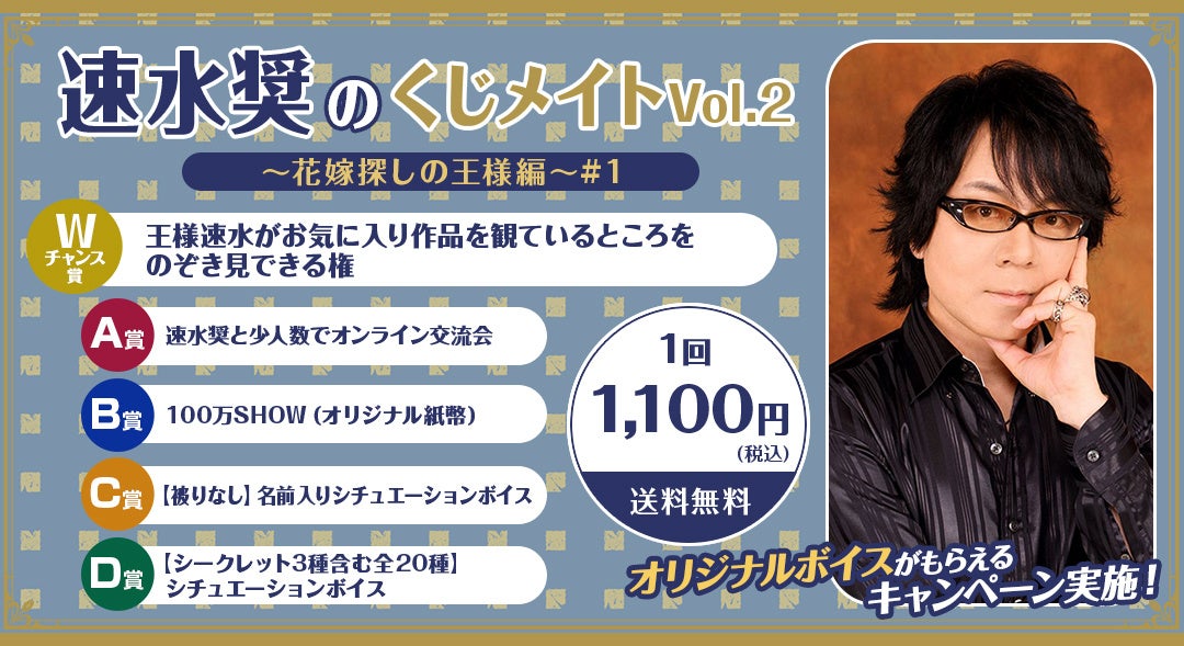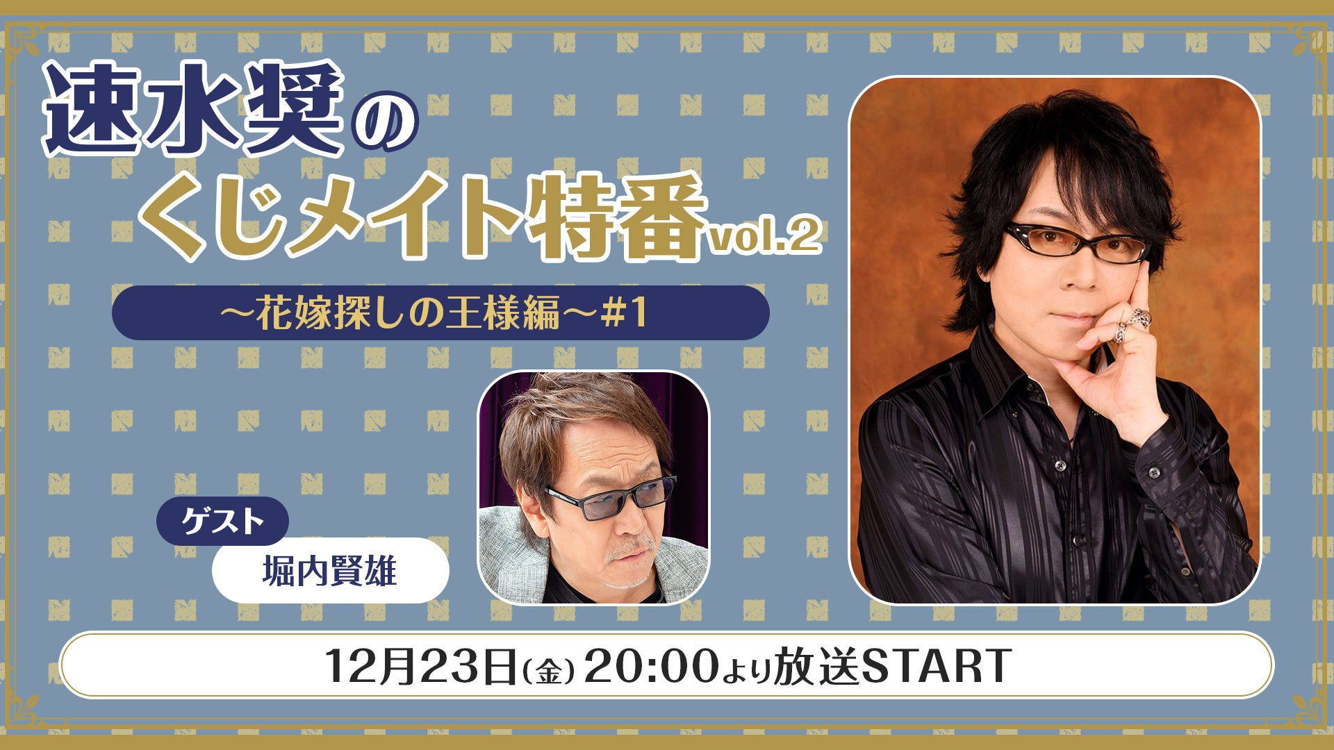 12月23日(金)放送の「速水奨のくじメイト特番Vol.2~花嫁探しの王様編~#1」は、アニメイトのオンラインくじサービス「くじメイト」において、速水奨さんのくじメイト第2弾が12月16日(金)より販売開始となったことを記念して行われる特別番組です。