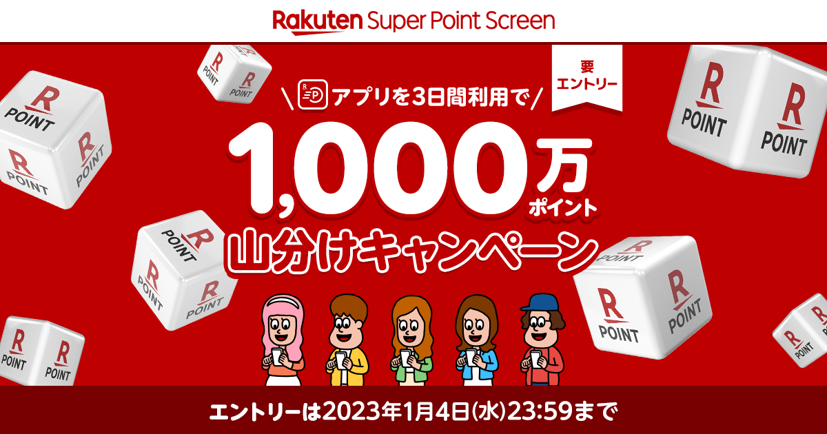 詳細: 「Super Point Screen」アプリのキャンペーンページからエントリーのうえ、達成期間中にアプリを合計3日間以上利用したユーザーを対象に、1,000万ポイントの「楽天ポイント」期間限定ポイントを山分けで進呈