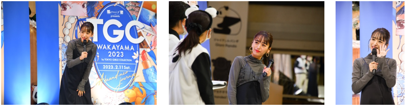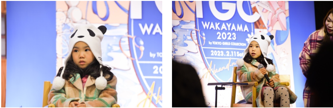 パンダの帽子を被って登場した望蘭(チビみらん)は、色々な動物に触れ合えるアドベンチャーワールドにちなみ、好きな動物は?と聞かれると「犬とうさぎ。」と少し緊張気味に回答。MCから緊張していますか?と聞かれると、照れながらも顔にはにっこりとSmileが。望蘭(チビみらん)はTGC 和歌山 2023でTGC初出演が決定しており「緊張します。緊張する時は、笑え笑えって言ったらさ、笑えるようになる。保育園の先生が教えてくれたおまじない。」と、緊張をほぐす時のおまじないを教えてくれました。MCから意気込みを聞かれると「意気込みってなに?」とお母さんとの一面が。TikTokに公開されている動画さながらのお母さんとの会話に、会場が暖かな空気に包まれる中「TGC頑張ります!」と意気込みを語りました。最後に、望蘭(チビみらん)に会いにきた来場者に向けて「いつもありがとうございます。」と、お母さんと手を繋ぎながらメッセージを送りました。