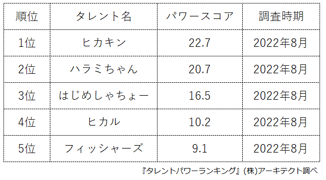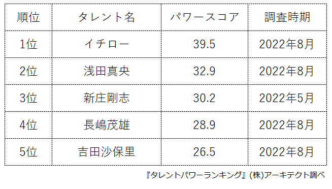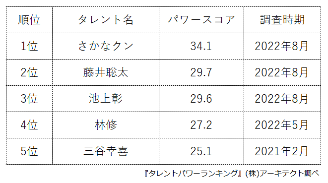 『タレントパワーランキング』では、タレントパワーランキングに登録されている文化人、アスリート、YouTuberとして活躍している著名人のスコアを調査。