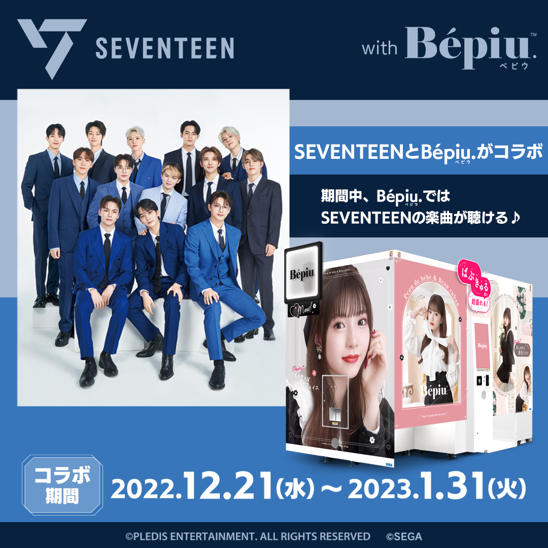 株式会社セガ(本社:東京都品川区、代表取締役社長COO:杉野行雄、以下 セガ)は、好評稼働中の最新プリクラ機『Bépiu.(ベピウ)』において、K-POPグループ「SEVENTEEN」とのコラボを2022年12月21日(水)から2023年1月31日(火)の期間限定で開催いたします。