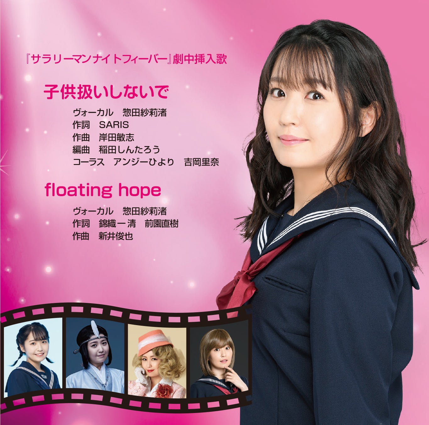 2022年8月から全国巡業し、10月の大阪松竹座で大千穐楽を迎えた、錦織一清 作・演出の舞台『サラリーマンナイトフィーバー』に惣田紗莉渚はユキナ役として出演。そしてその劇中挿入歌としてユキナ(惣田紗莉渚)が歌った『子供扱いしないで』(作詞:SARIS 作曲:岸田敏志)と『floating hope』(作詞:錦織一清、前園直樹 作曲:新井俊也)の2曲が、全世界に向けて配信されることが決定しました! 配信開始は12月19日から。