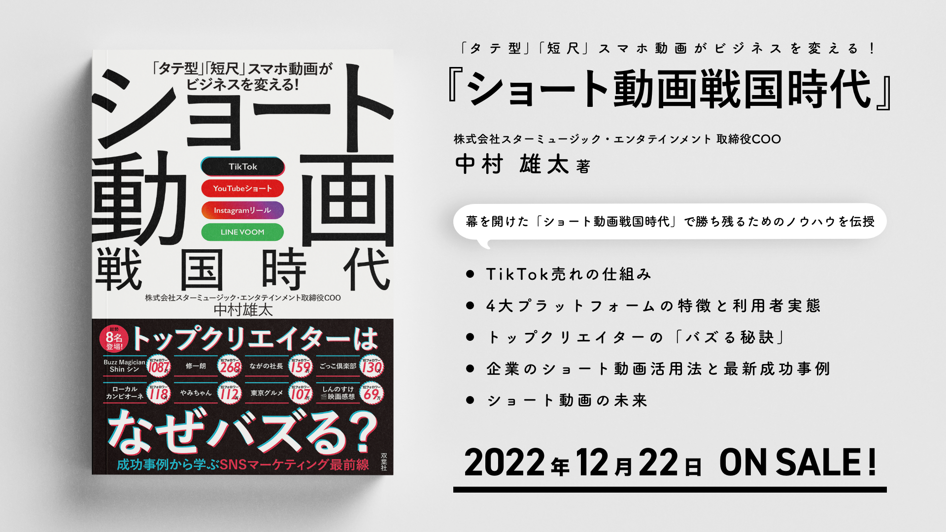 エンタテインメントに関する幅広いソリューションを提供する株式会社スターミュージック・エンタテインメント(本社:東京都渋谷区、代表取締役:渡邊 祐平、以下スターミュージック)は、取締役COO 中村雄太による著書『ショート動画戦国時代 「タテ型」「短尺」スマホ動画がビジネスを変える!』が2022年12月22日(木)に発売することをお知らせいたします。