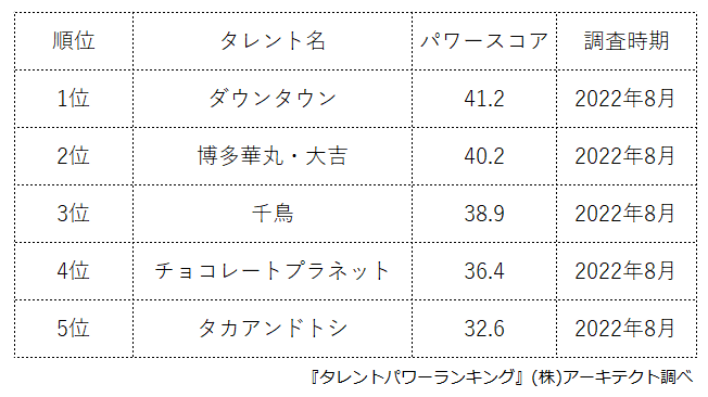 『タレントパワーランキング』では、タレントパワーランキングに登録されている吉本興業に所属するお笑い芸人のスコアを調査。