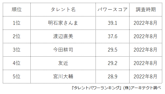 株式会社アーキテクトが実施するタレント調査は、タレントパワーランキングと呼ばれ、日本国内で活動するタレントから1280名をリストアップし、認知度と誘引率を掛け合わせ「パワースコア」を算出して形成しています。