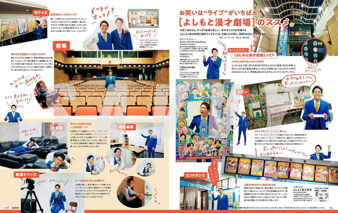 [よしもと漫才劇場][森ノ宮よしもと漫才劇場][よしもと祗園花月]など、お笑いの劇場周辺にはおいしい、楽しいお店がいっぱい!人気若手芸人たちに、SAVVYおすすめのスイーツやカフェ、コスメを紹介しています。