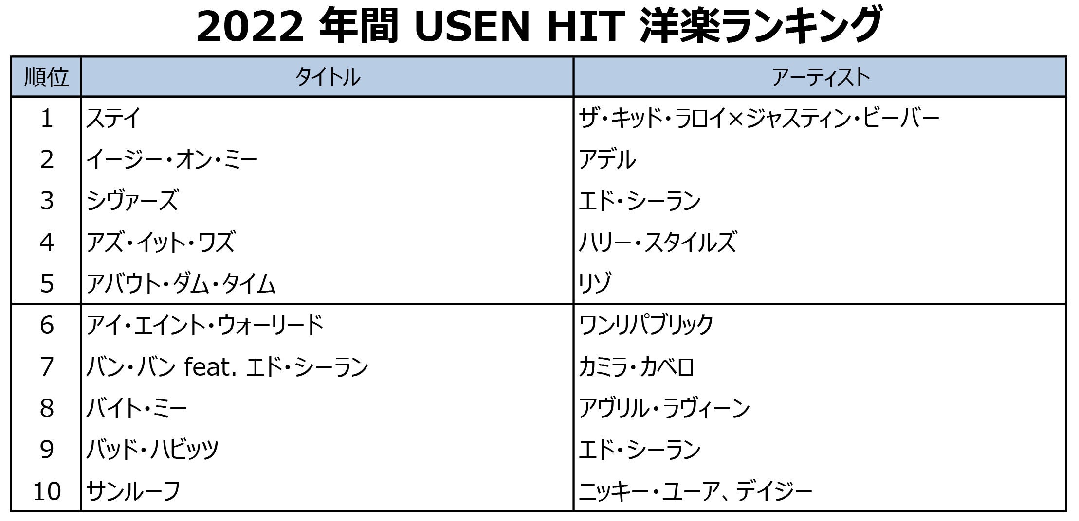 2022年間 USEN HIT ランキングでは、各ジャンルの11位以降の曲やK-POPランキング、アニメランキング、J-POP/洋楽ランキングをWEBで公開しています。