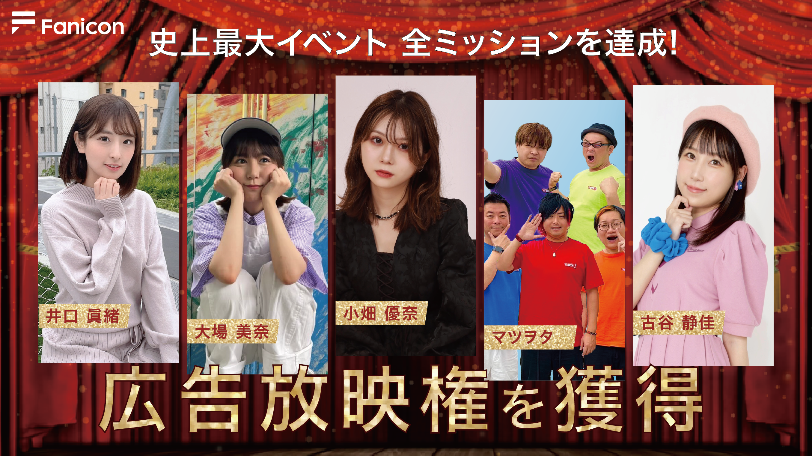 THECOO株式会社(本社:東京都渋谷区、代表取締役CEO:平良真人、証券コード:4255)が運営する会員制ファンコミュニティプラットフォーム「Fanicon(ファニコン)」は2022年9月22日(木)~10月9日(日)の期間で開催した『史上最大イベント!ビジョン広告放映権を手に入れろ!』において、参加コミュニティ2000組の中から見事、井口眞緒・大場美奈・小畑優奈・マツヲタ・古谷静佳(※五十音順)のコミュニティが、全ミッションを達成し広告放映権を獲得いたしましたので、お知らせいたします。本日12月23日(金)より渋谷ビジョンにて5コミュニティのPR動画を放映いたします。