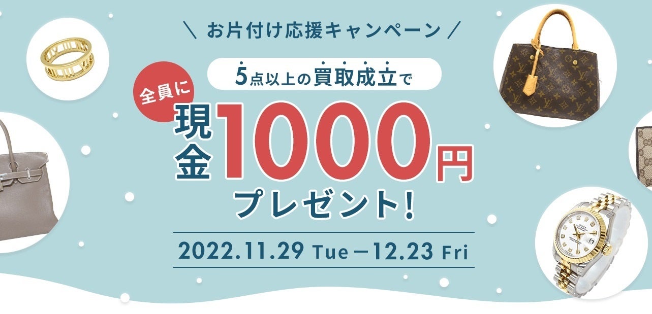 また、現在はバッグの査定額アップキャンペーンと、現金1,000円をプレゼントするお片付け応援キャンペーンを12月23日(金)まで開催中です。この機会に簡単・便利なブランディアBellをぜひご利用ください