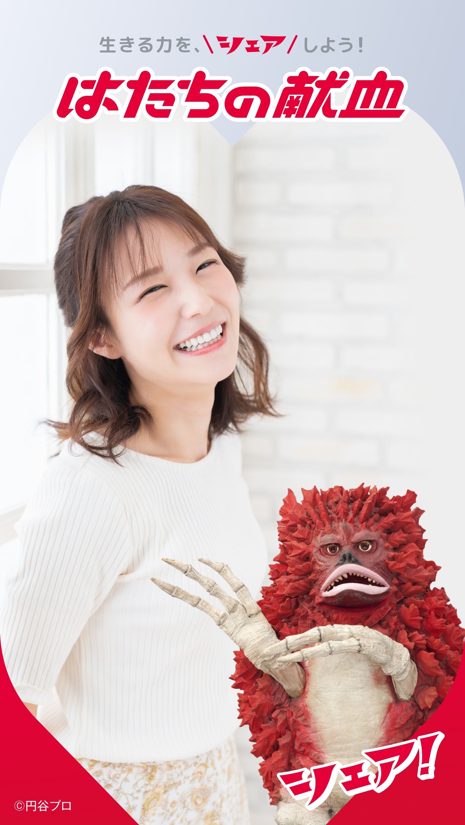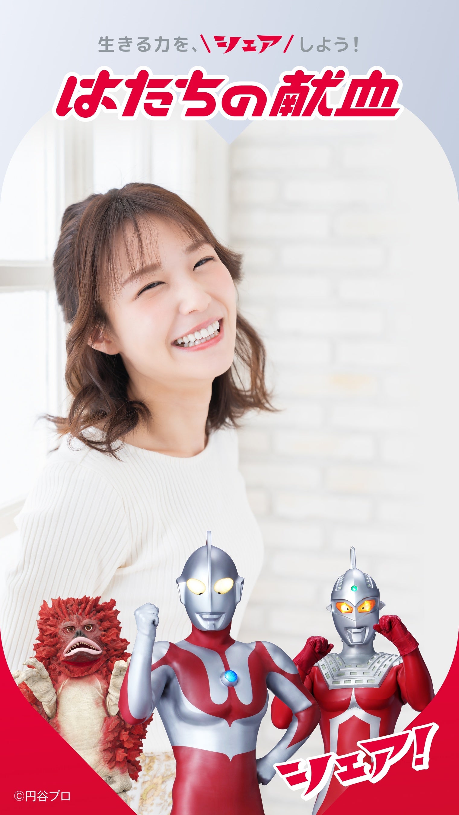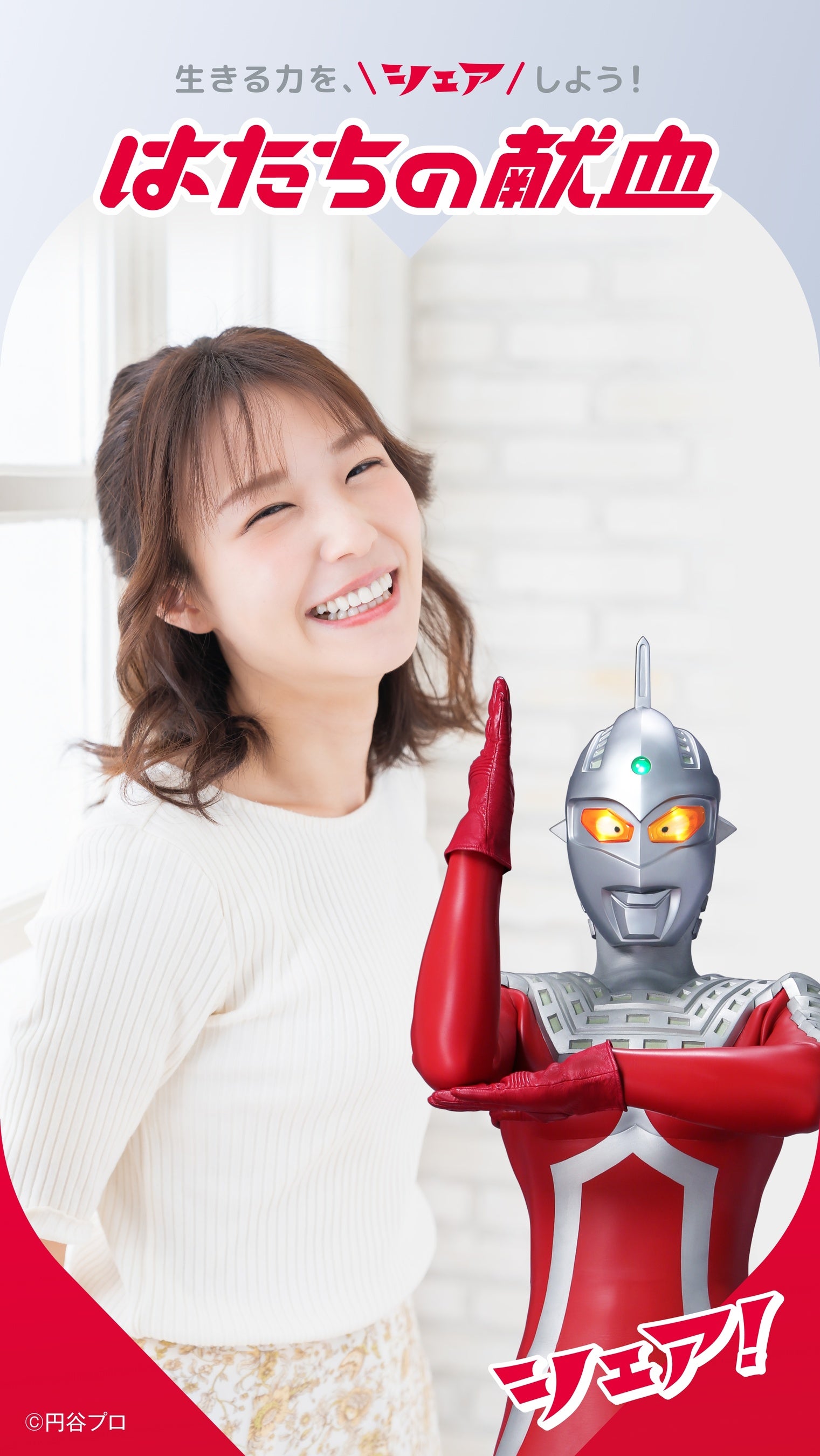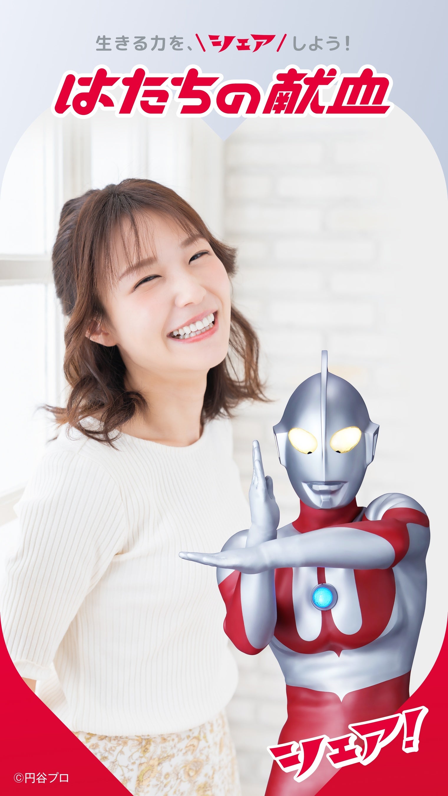 髙橋ひかるさんとウルトラマンが日本赤十字社の献血会場等にポスターでも登場。二人で力強く前向きに献血を推進します。ポスター内では髙橋ひかるさんが指ハートとスペシウム光線ポーズが融合した「元気シェアポーズ」も披露しています。この「元気シェアポーズ」は髙橋さんが踊るTikTok「元気シェアダンス」にもちりばめられています。ぜひご注目ください。