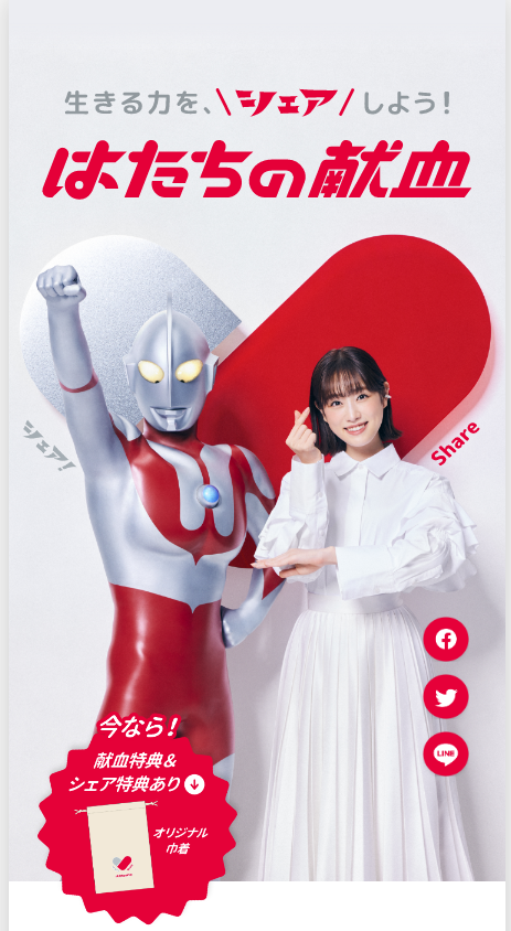 令和5年のキャンペーンキャラクターには、女優の髙橋ひかるさんと、国民的ヒーローのウルトラマンに就任いただきました。CMコンセプトは『献血は生きる力のシェア』。CMでは、ケーキをシェアしたり、SNSで写真をシェアしたり、イヤホンで音楽をシェアするなど、日常にあふれる様々な“シェア”をする、髙橋ひかるさん。すると、髙橋さんがシェアするたびに聞き覚えのある、あの「シェア!」の声が響きます。最後に髙橋さんが献血に行くのを優しく見守るウルトラマンが登場。国民的ヒーローのウルトラマンの“シェア!”という掛け声とともに、はたち世代を代表する髙橋さんが「献血は、生きる力をシェアできる。」と、献血の大切さを力強く前向きに伝えています。