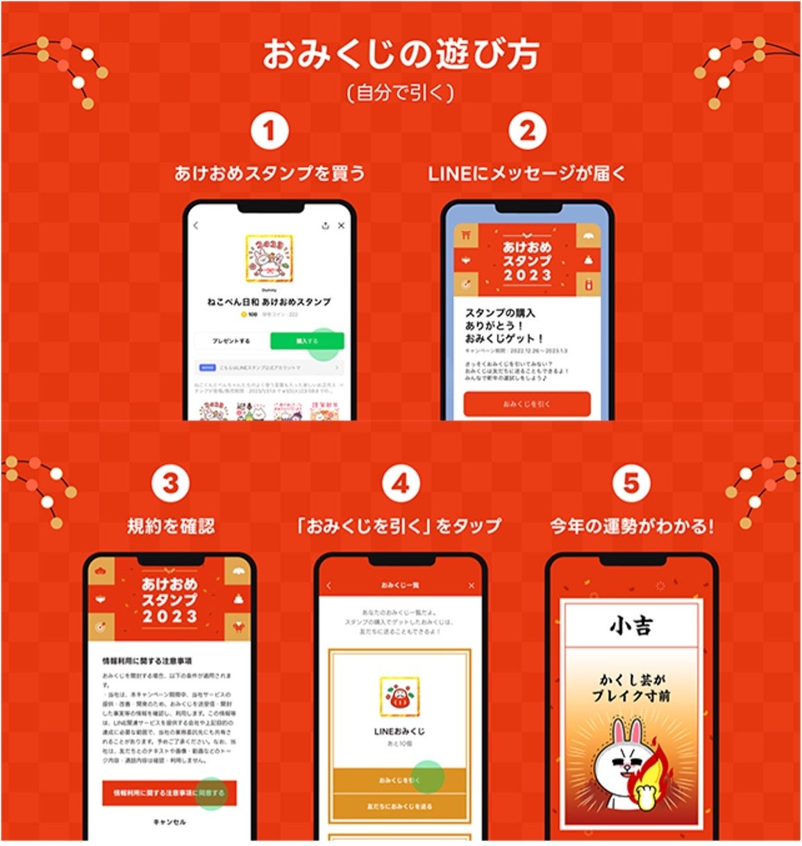 2023年1月3日(火)までの期間中に、対象の「あけおめスタンプ」を購入または友だちからもらうと、2023年の運勢が占える「おみくじ」を引くことができます。「おみくじ」は、2022年12月26日(月)から2023年1月3日(火)まで開封可能です。公式スタンプの大吉から凶までの「おみくじ」に描かれているイラストは、全て特別に描き下ろされたもので、「おみくじ」の結果ごとに様々なキャラクターの描き下ろしイラストを楽しんでいただけます。