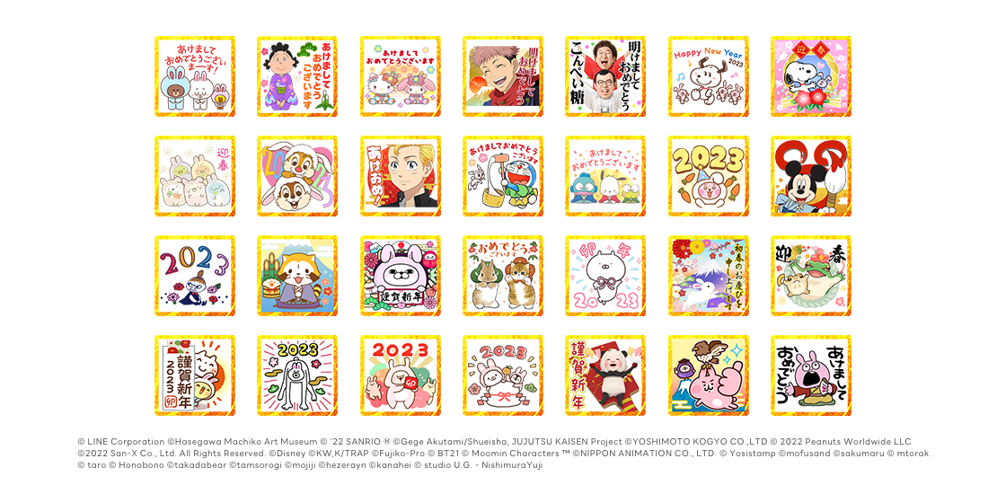 『あけおめスタンプ2023』は、スタンプの周囲が金枠で囲まれており華やかなデザインとなっております。「サザエさん」「呪術廻戦」「ジョイマン」「東京リベンジャーズ」などの人気キャラクターや今年の干支である「卯」の人気キャラクターなどのLINE公式スタンプおよび、LINEクリエイターズスタンプを販売しております。それぞれの詳しいラインナップは特集ページからご確認ください。