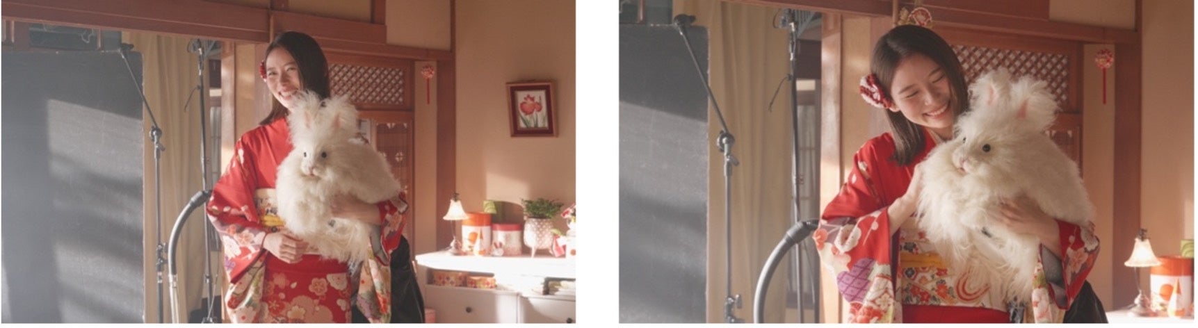 2023年は卯年ということで、アンゴラウサギの人形と共演をした朝日さん。朝日さんの演技に合わせて顔の向きを変えたり口を動かしたりと演技をするアンゴラウサギの人形に「本当に生きてるみたい!」と驚く朝日さん。細かく動きを再現するアンゴラウサギの人形に「めっちゃすごい(笑)」と、本物そっくりなアンゴラウサギの人形に興味津々。カットの間もアンゴラウサギを撫でて可愛がっていました。