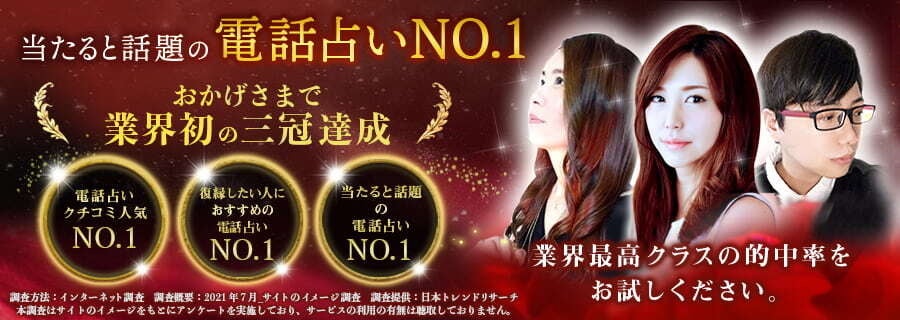 電話占いカリスは当たると口コミで話題の電話占いです。200万件以上の鑑定実績があり、芸能人も占ったりメディア出演のある人気占い師が多数所属し、多くの方の悩みを解決してきました。2021年7月には、日本トレンドリサーチが行うインターネット調査にて電話占い業界初三冠(電話占い口コミ人気/復縁したい人におすすめの電話占い/当たると話題の電話占い)を達成した事でも話題になりました。