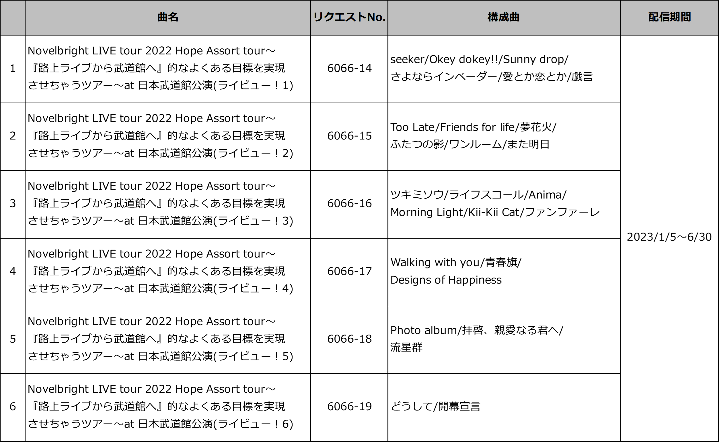 「ライビュー!」において、2022年に開催されたNovelbright初の日本武道館公演「Novelbright LIVE tour 2022 Hope Assort tour~『路上ライブから武道館へ』的なよくある目標を実現させちゃうツアー~at 日本武道館公演」より、渾身のライブ映像を2023年1月5日より期間限定で独占配信します。