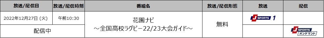 国内最大4チャンネルのスポーツテレビ局、株式会社ジェイ・スポーツ(本社 東京都江東区、代表取締役社長 長谷 一郎、以下「J SPORTS」※1)は、12月27日(火)から2023年1月7日(土)にかけて東大阪市花園ラグビー場で開催される「第102回全国高等学校ラグビーフットボール大会」の全試合を生中継いたします。また、PC、スマホ、タブレットで見られる動画配信サービス「J SPORTSオンデマンド※2」でも全試合をLIVE配信いたします。