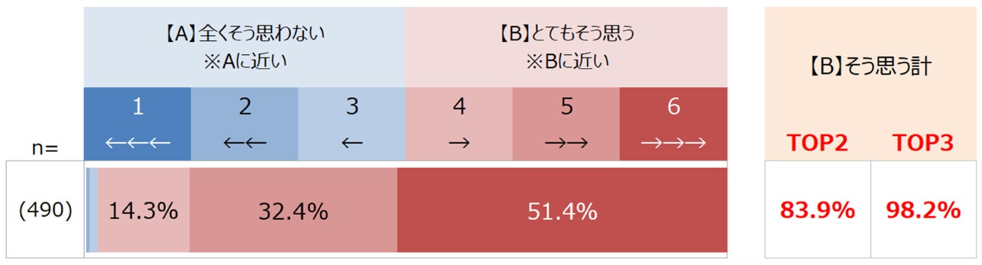 小児・AYA世代のがんについて関心が高まったと回答した人は(TOP3【4-6と回答】)98%。TOP2【5-6と回答】で84%となっています。