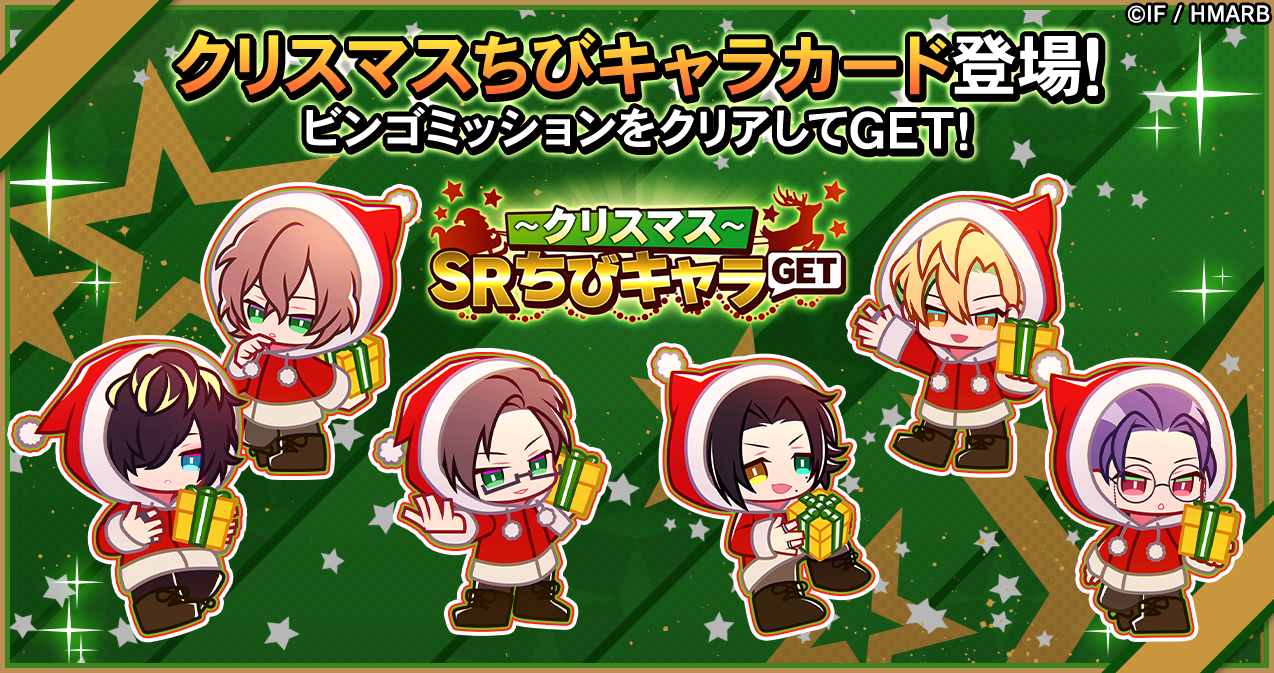 クリスマスキャンペーンのうち、「~クリスマス~SRちびキャラGET ビンゴミッション」では、「SR【くりすますぷれぜんと】山田二郎」「SR【くりすますぷれぜんと】入間銃兎」「SR【くりすますぷれぜんと】夢野幻太郎」「SR【くりすますぷれぜんと】伊弉冉一二三」「SR【くりすますぷれぜんと】躑躅森盧笙」「SR【くりすますぷれぜんと】四十物十四」を獲得することができます。