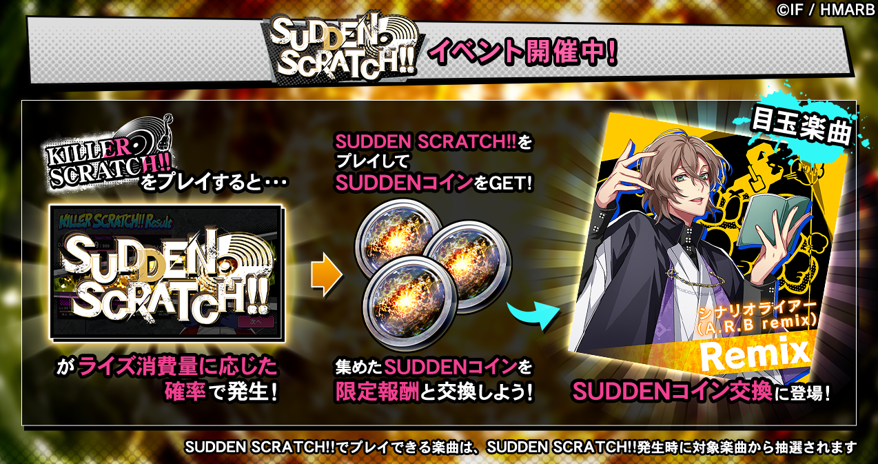 イベント期間中、KILLER SCRATCH!!をプレイするとライズ消費量に応じた確率でSUDDEN SCRATCH!!が発生します。SUDDEN SCRATCH!!をプレイすると、通常の報酬アイテムの他、限定アイテム「SUDDENコイン」を獲得することができます。「SUDDENコイン」を集めることで、新楽曲「シナリオライアー(A.R.B remix)」と交換することが可能です。詳細はアプリ内お知らせをご確認ください。