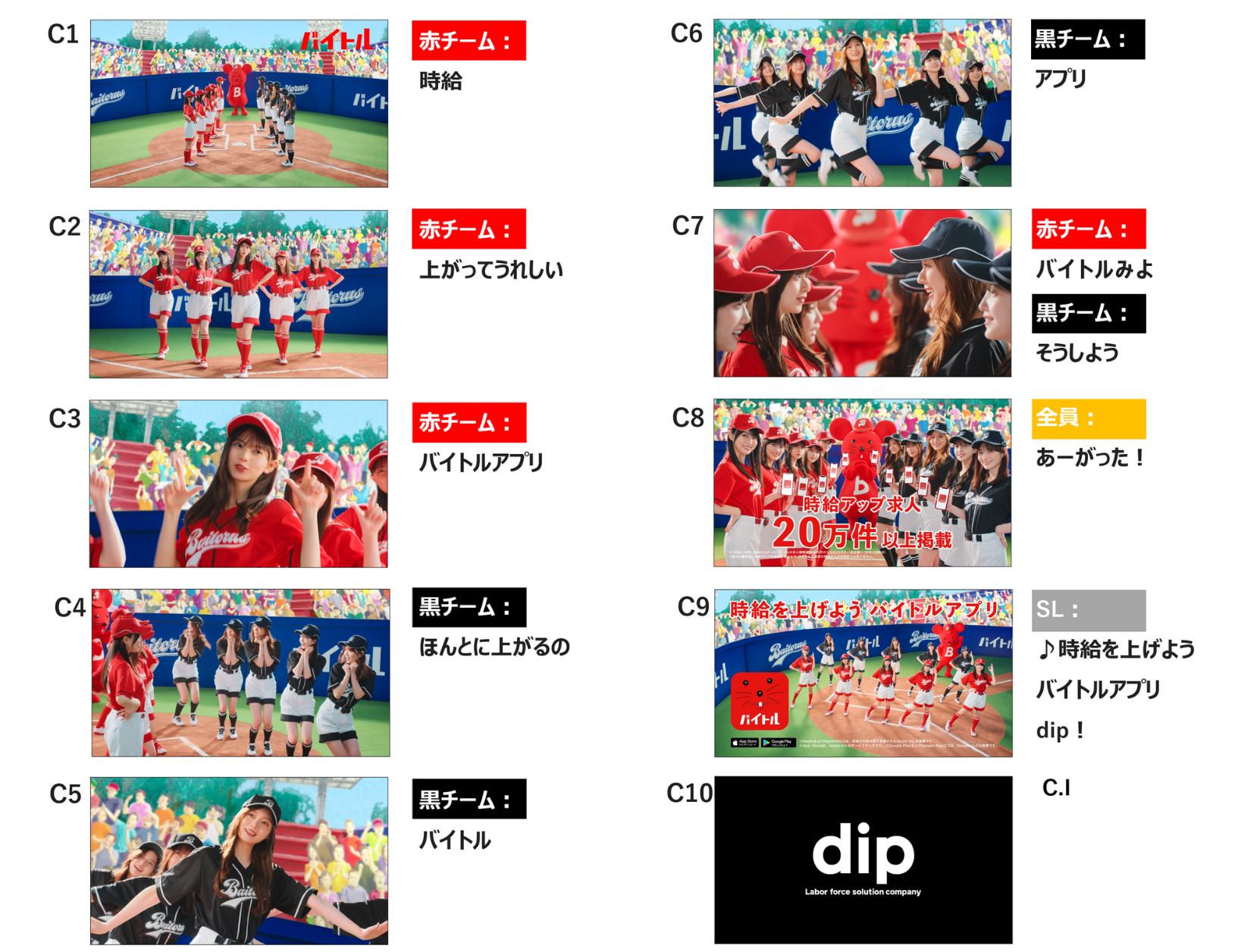 当社は人手不足の解消とともに働く人の待遇向上を実現するため企業へ“時給アップ”を働きかける取り組み「ディップ・インセンティブ・プロジェクト」を昨年より実施しています。その一環として、新TVCMを制作いたしました。新TVCMには、「バイトル」のイメージキャラクターである「乃木坂46」から齋藤飛鳥さん、山下美月さん、賀喜遥香さん、遠藤さくらさん、与田祐希さん、梅澤美波さん、久保史緒里さん、田村真佑さん、鈴木絢音さん、金川紗耶さんの総勢10名が出演します。乃木坂46が出演してきたバイトルのCMにおいて、これまでで最多出演人数となる10名での迫力の”はないちもんめ”と、今回「バイトル」のCM初出演となる田村さん、鈴木さん、金川さんの初々しいバイトルダンスにもご注目ください。