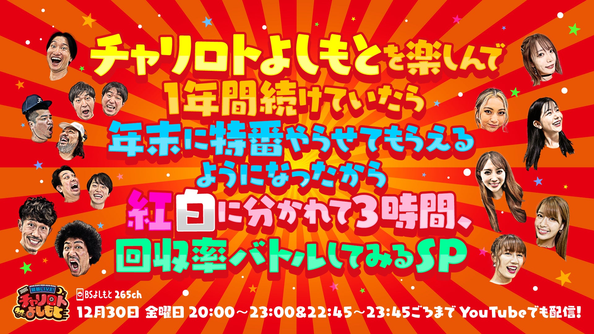 BSよしもとで毎週(月)~(金)生放送でお届けしている「競輪LIVE!チャリロトよしもと」が、この度、年末12月30日(金)に3時間生特番となる「チャリロトよしもとを楽しんで1年間続けていたら年末に特番やらせてもらえるようになったから紅白に分かれて3時間、回収率バトルしてみるSP」を放送することが決定しました。