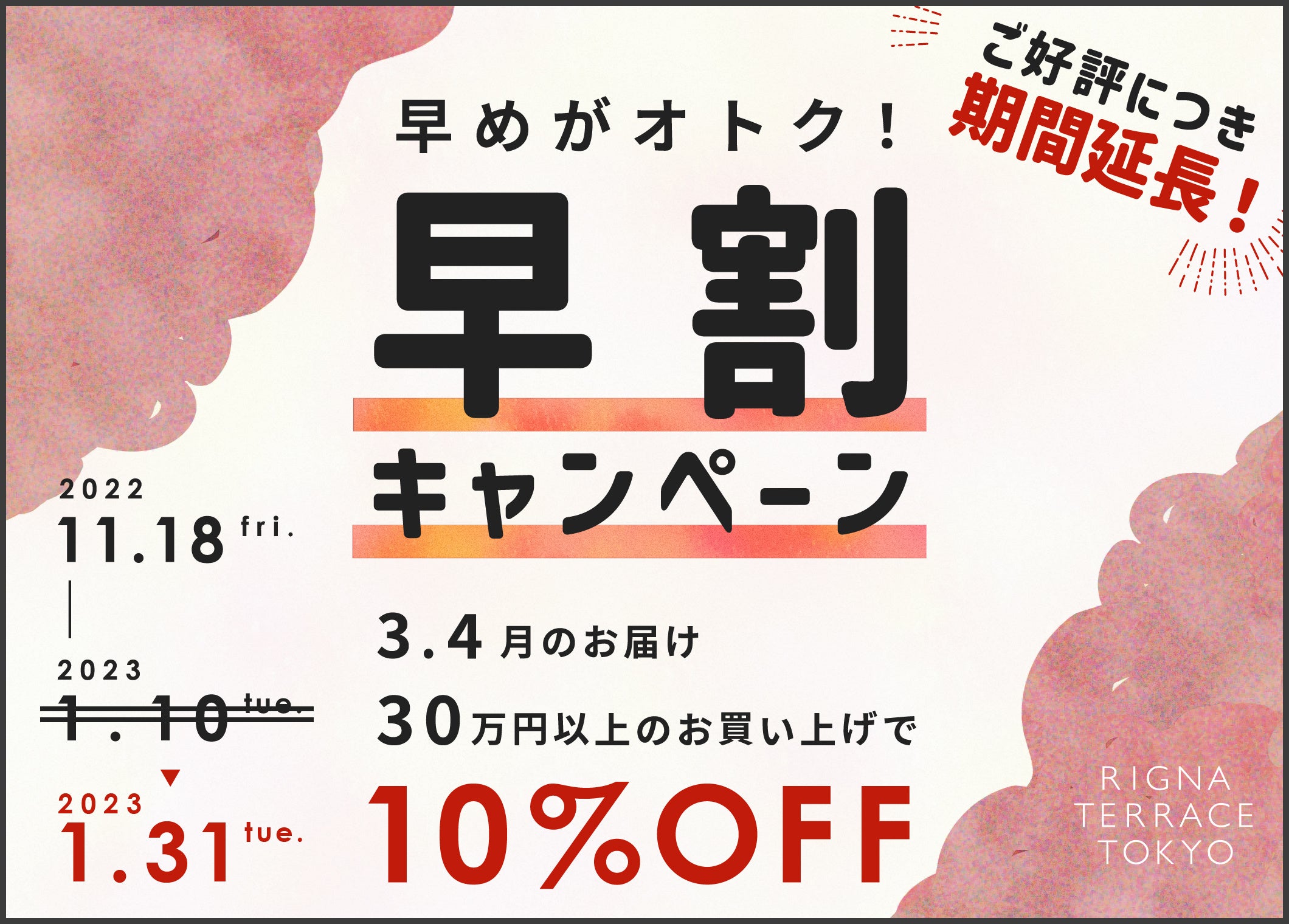 ※早割にてお申し込みいただいた場合、在庫がある商品であっても3月~4月のお届けとなります。
