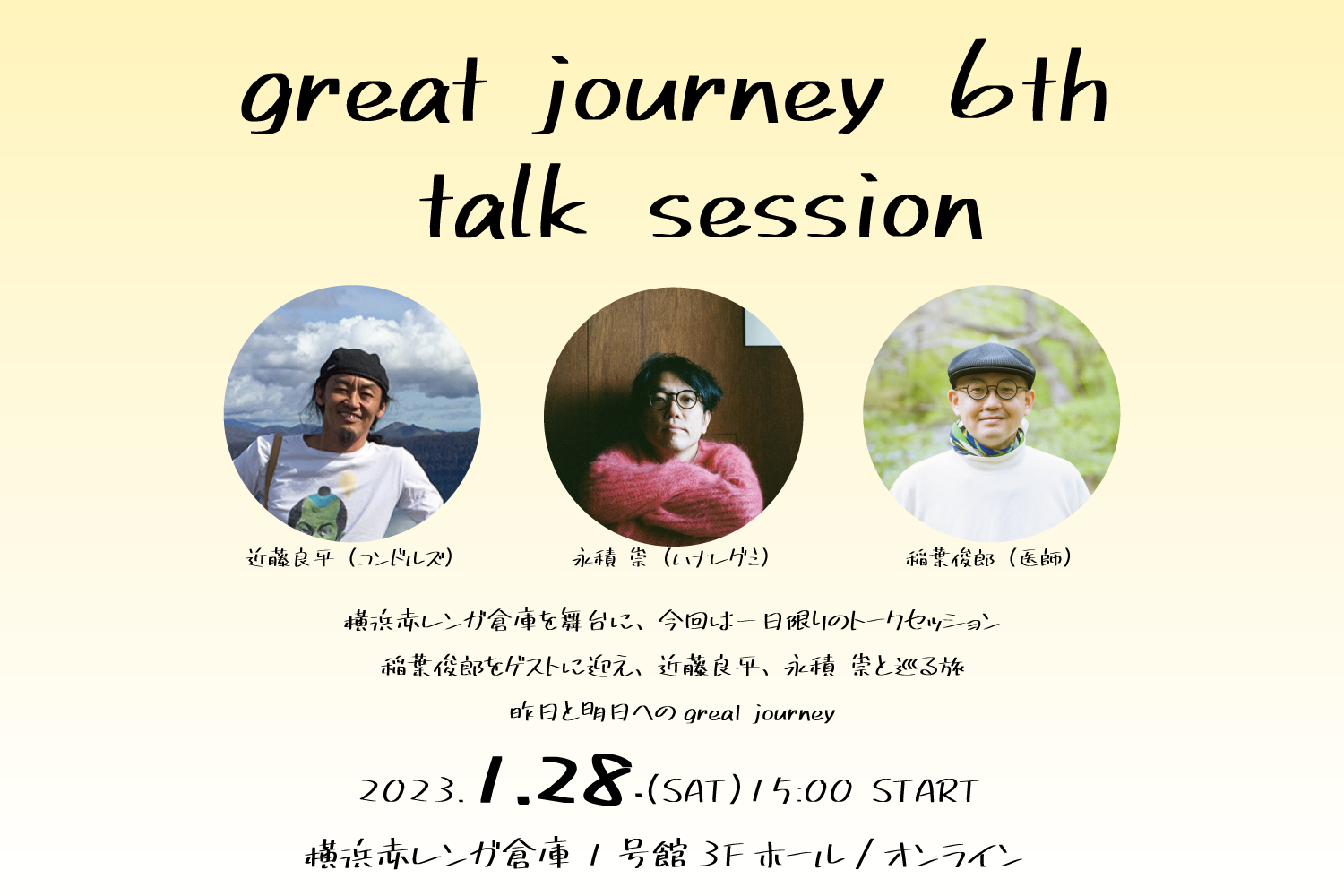 2016年にはじまった「great journey」は、ダンス集団・コンドルズを主宰しダンスを軸に演劇、映画、テレビなど多角的に活躍する近藤良平と、ハナレグミ名義で2002年からソロ活動をスタートし、シンガーとして、作曲家・作詞家としても第一線で活躍する永積 崇が、毎年一回、横浜赤レンガ倉庫に集い観客と一緒になってつくり上げる人気シリーズです。6回目となる今回は、「いのちの居場所」等の執筆活動や文化芸術分野でも活躍する医学博士・稲葉俊郎をゲストに迎えて、3人で一日限りのトークセッションを繰り広げます。当日赤レンガ倉庫の空間で参加する方法、後日オンラインで視聴する方法の2つを用意しました。