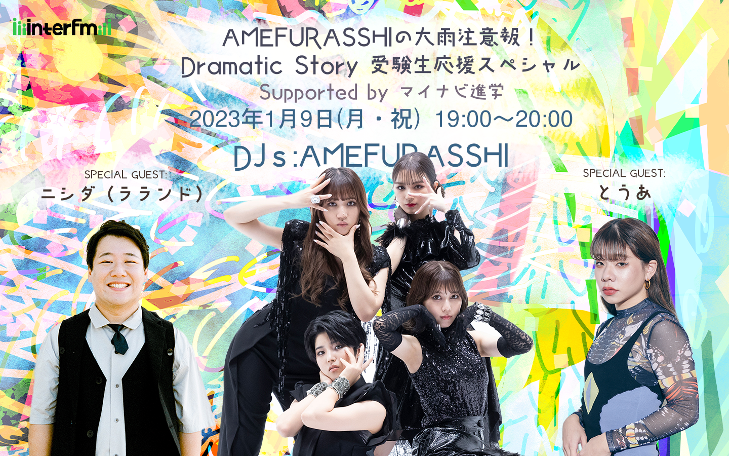 interfm(TOKYO:89.7MHz)は、2023年1月9日(月・祝)19:00からアイドルグループ「AMEFURASSHI」がメインDJを務める『AMEFURASSHIの大雨注意報!Doramatic Story受験生応援スペシャルSupportted by マイナビ進学』の1時間のホリデースペシャル特別番組を放送することが決定しましたのでお知らせ致します。