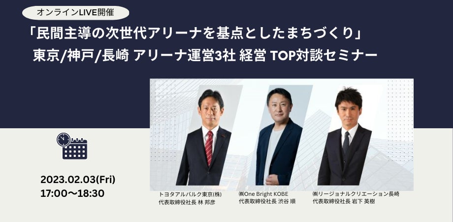神戸アリーナプロジェクトを推進する株式会社One Bright KOBE(住所:兵庫県神戸市、代表取締役社長 渋谷 順)は、TOKYO A-ARENA PROJECT(東京・お台場/青海)運営会社:トヨタアルバルク東京株式会社(住所:東京都文京区、代表取締役社長 林 邦彦)と長崎スタジアムシティプロジェクトの運営会社:株式会社リージョナルクリエーション長崎(住所:長崎県長崎市、代表取締役社長 岩下 英樹)の3社にて「民間主導の次世代アリーナを基点としたまちづくり」をテーマに、各社の取り組みを紹介するオンラインセミナーを開催いたします。