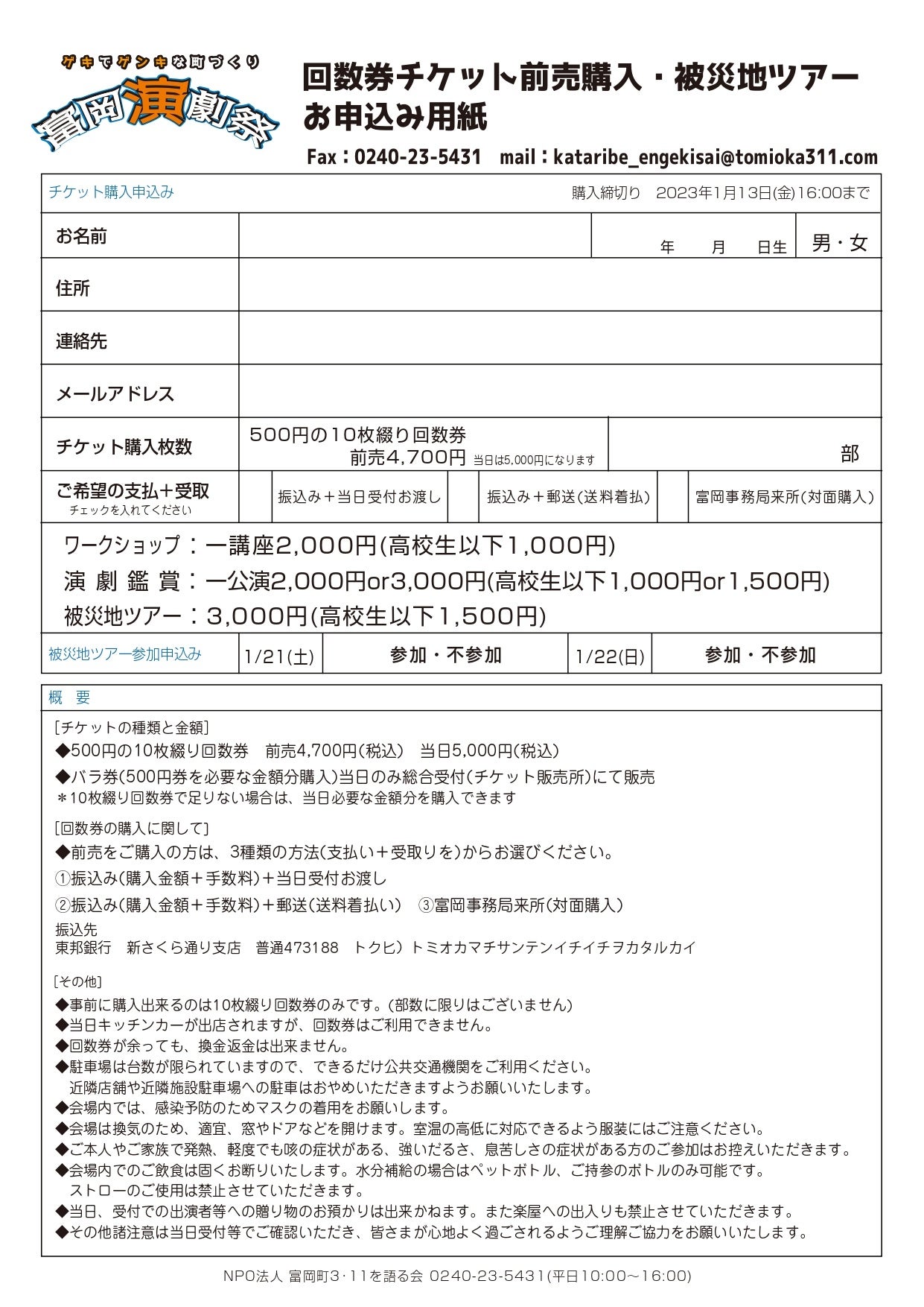 NPO法人富岡町3.11を語る会(福島県双葉郡富岡町中央3-53 代表 青木 淑子 ℡0240-23-5431)は、富岡町で東日本大震災・原子力災害の伝承活動をしている。人を育成するための表現の1つである「演劇」で町を元気にできないかと考え、富岡演劇祭を開催をする。2023年1月20日~22日