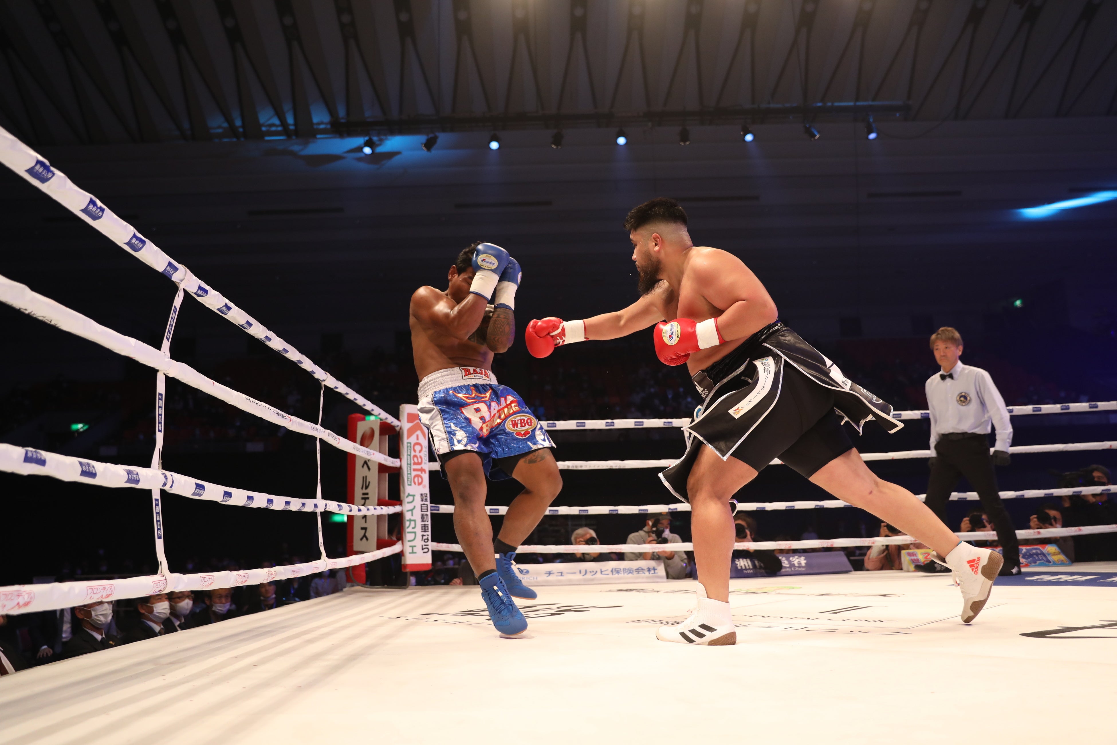 サトシ・イシイの身長はチャンス選手より2cm低い181cm。ほぼ同じ体格の両者によるヘビー級らしい強烈な打ち合いが序盤から続いた。互いの肩がぶつかるほどの近接戦が続く4ラウンドだったが、互いにパンチをもらっては打ち返す、一進一退の試合運びとなった。