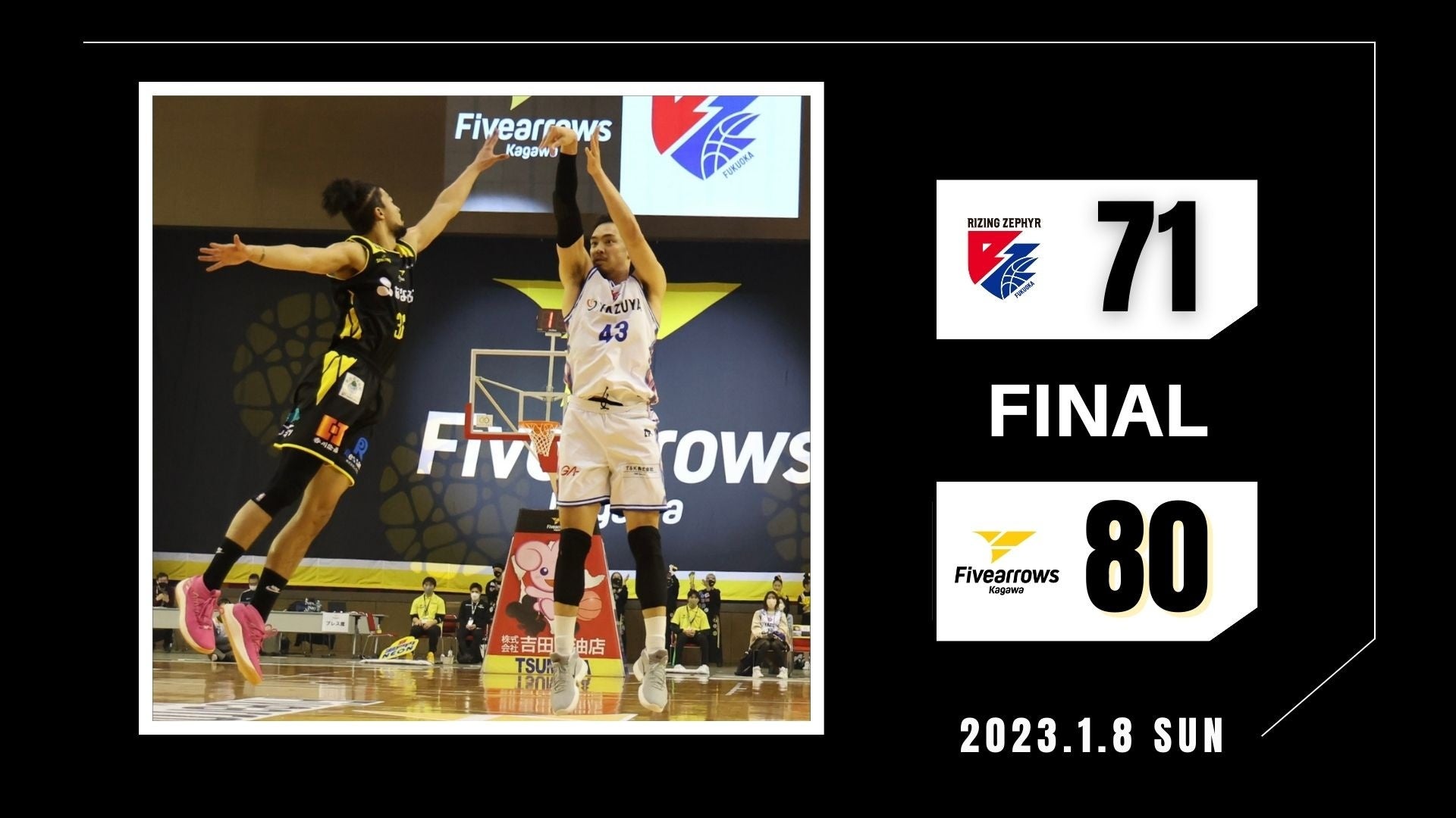 この展開を打開したい福岡は後半開始早々、メンバーを入れ替えて臨むが、攻撃がかみ合わず香川にリードを奪われてしまう。リズムを失った福岡は一時10点のリードを奪われ、香川に主導権を奪われるも#6大塚の連続3Pシュート、#23ハリスの個人技で同点まで追いつくが勝ち越しを狙うオフェンスを得点に繋げられなかった福岡は勝利を逃した。
