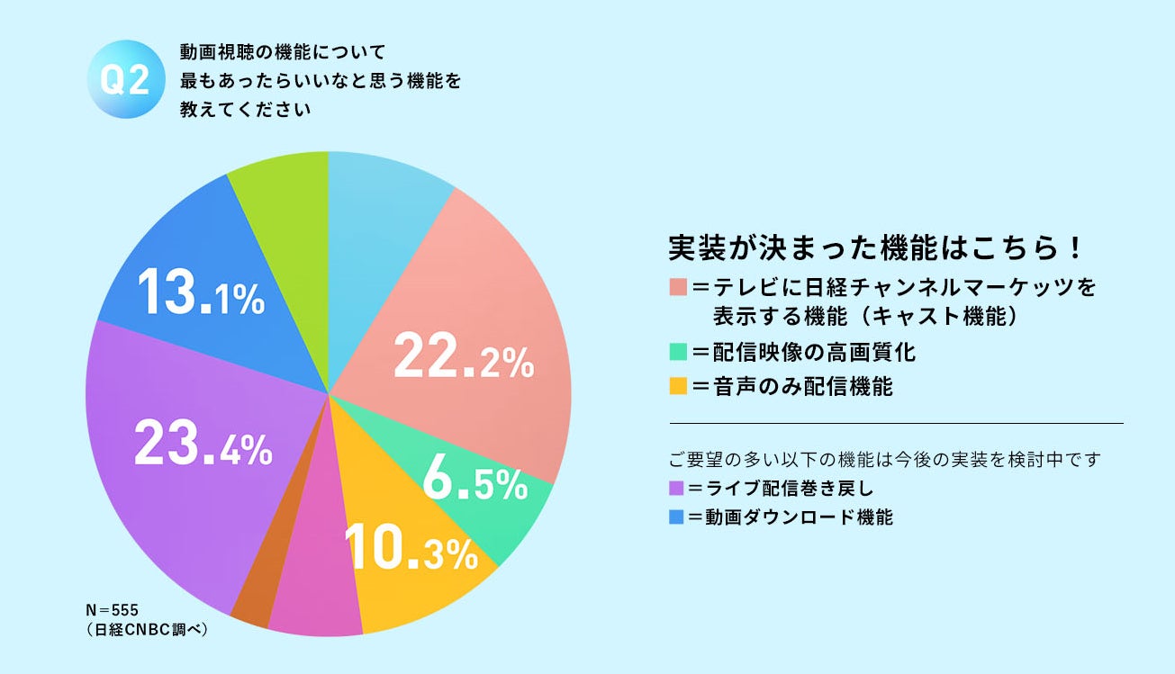 特に働きながら日経CNBCの視聴を行う層から、生活スタイルに合わせた利便性を求める声が多数集まりました。スマートフォン・タブレットユーザーからは専用視聴アプリの実装や、通信容量の節約に便利なLIVE配信の音声のみ機能を望む回答が集まっており、マーケットや速報ニュースのテキスト情報掲載を望む声も多数集まりました。また、シニアユーザーからは画面の高画質化や大画面モニターにミラーリング投影するキャスト機能など、画面上に表示している資料や情報の視認性を高める機能に声が集まる結果となっています。これらの視聴ニーズに応えた機能の追加、拡充は2023年4月にリリースを予定する「日経CNBC online」での実装を予定しています。