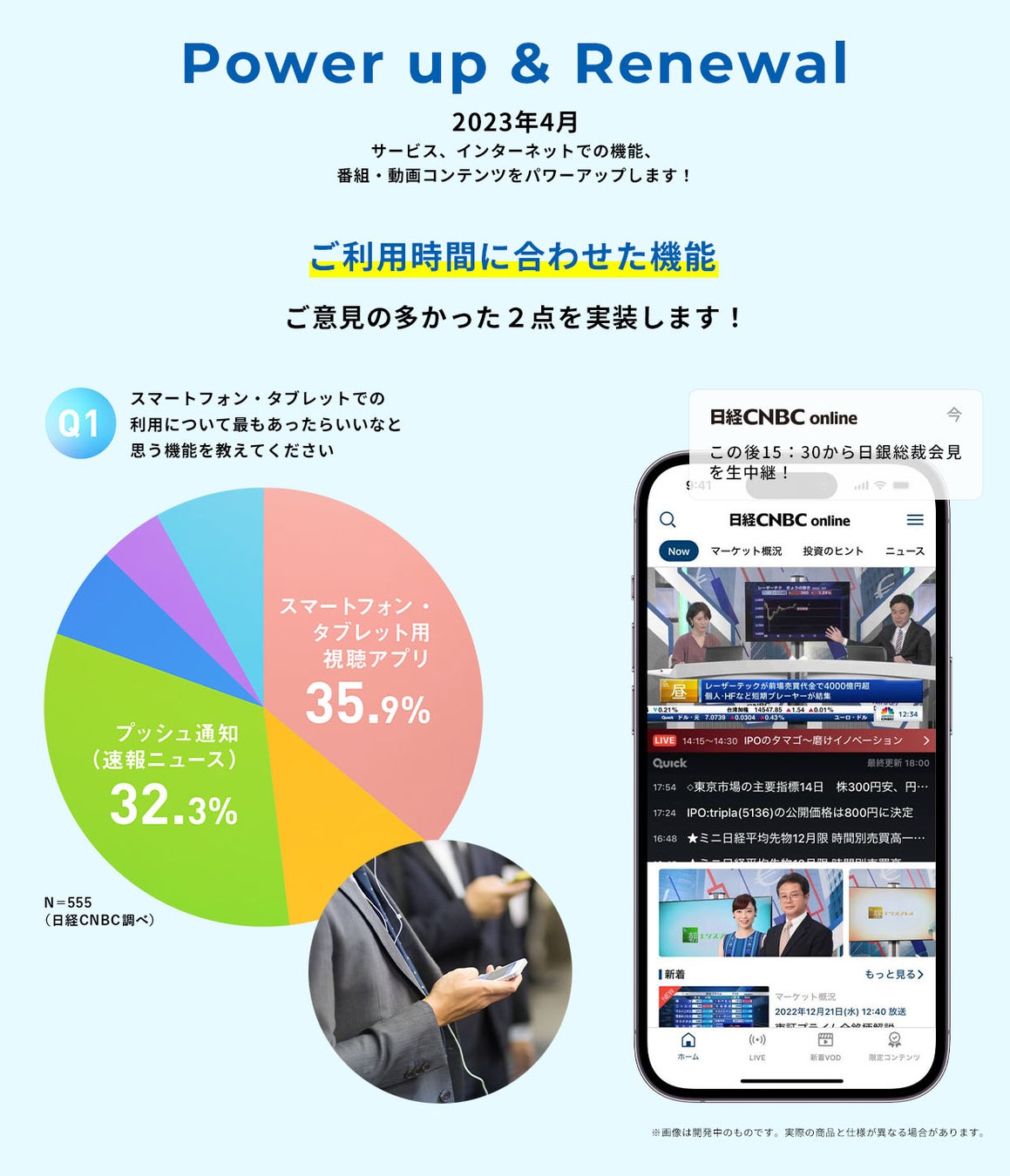 相場が大きく揺れ動いた2022年は、投資・資産運用を行う際の情報取得に、国内外の様々な情報を取り入れることが不可欠となりました。また、生活スタイルの多様化により、インターネット動画の視聴スタイルも大きな変革期にあります。そこで、日経CNBCでは、「日経チャンネルマーケッツ」の視聴者に向け昨年実施したアンケート調査の結果を受け、皆様からのご要望が多かった専用視聴アプリの実装など機能面を大幅にアップデートすることにしました。さらに使いやすく生まれ変わる「日経CNBC online」にご期待ください。