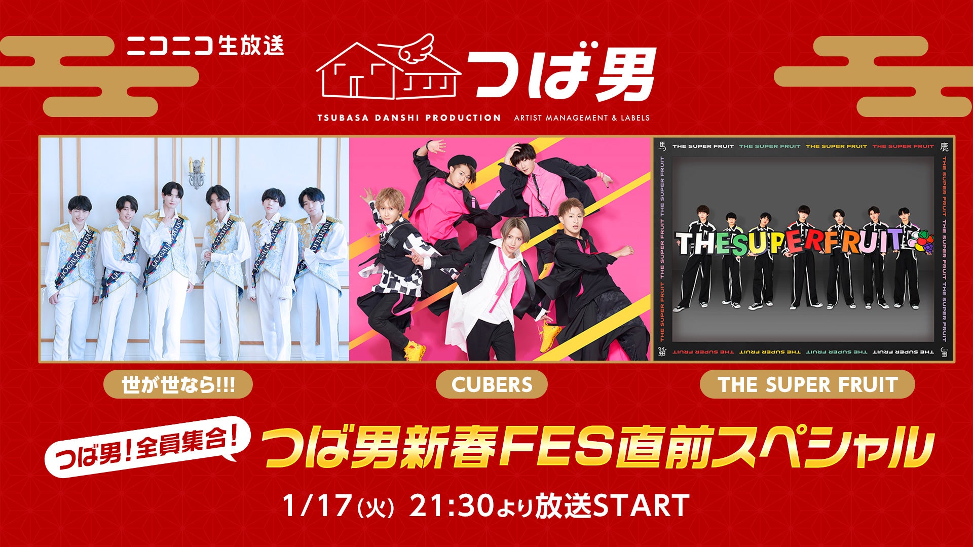 これに先駆け、ニコニコ生放送では、つばさ男子プロダクションに所属するCUBERS、THE SUPER FRUIT、世が世なら!!!の3組が出演するスペシャル番組を1月17日(火)21:30より放送する。