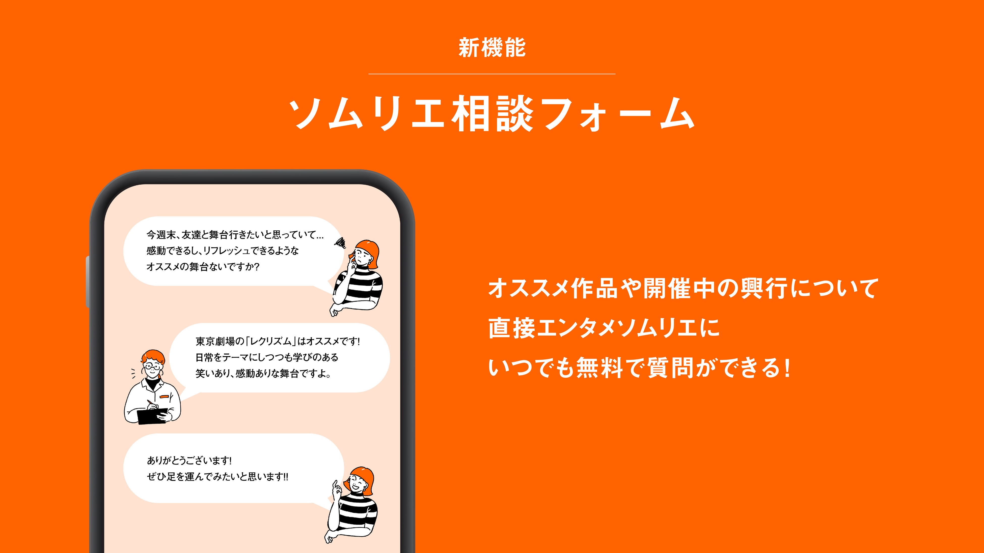 • 新機能①【ソムリエ相談フォーム】 オススメ作品や開催中の興行について、直接エンタメのプロにいつでも無料で質問ができる機能