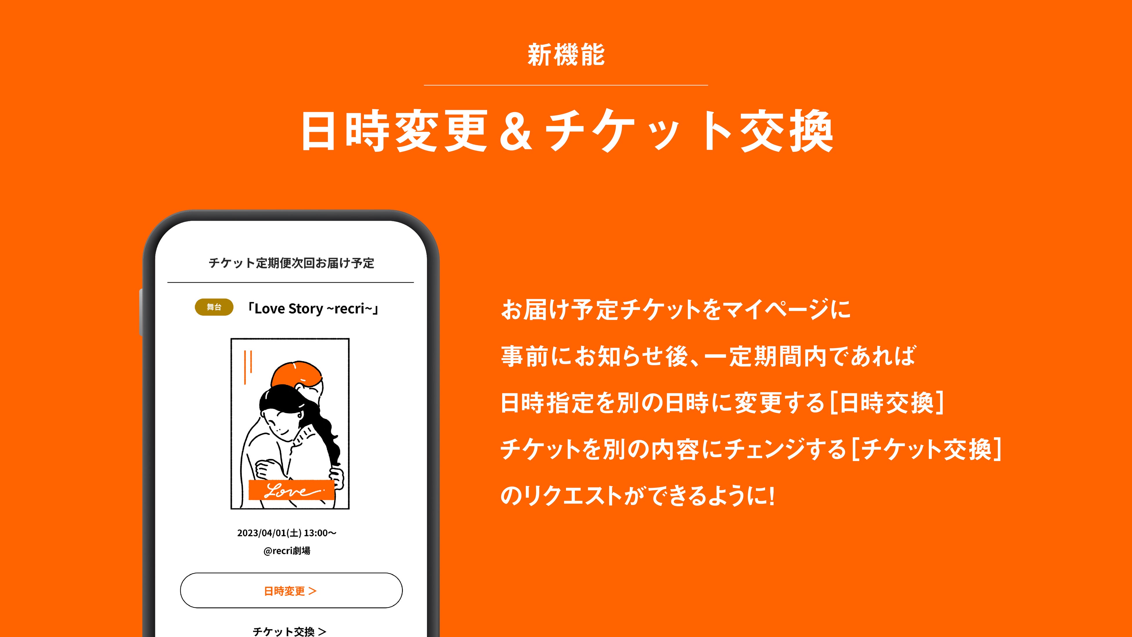 株式会社recri(レクリ)(東京都港区、代表取締役:栗林嶺)(https://subscription.recri.jp/)が運営する、 ユーザーの価値観や好みから[舞台・アート・映画・音楽]のオススメチケットが毎月定額届く、サブスク型チケット定期便「recri」は、 ユーザーからの声を元に、2023年1月1日より、2つの新機能を追加いたします。