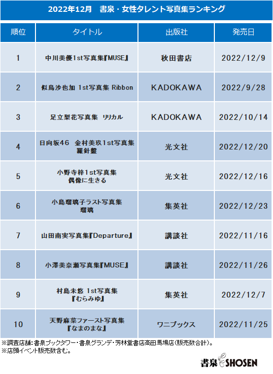 2022年12月「書泉・女性タレント写真集売上ランキング」発表!第1位は「中川美優1st写真集『MUSE』」!