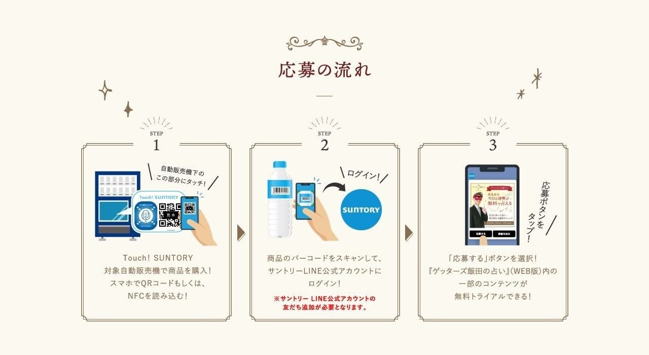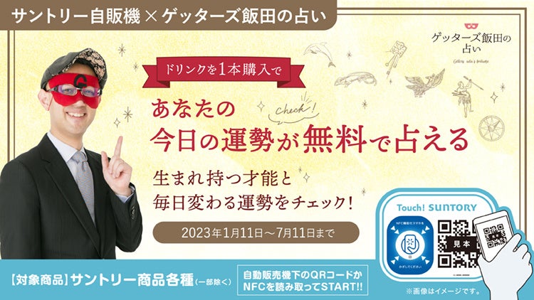 ・キャンペーン内容:対象となる「Touch!SUNTORY」が設置されている自動販売機にて、ドリンクを1本購入すると今日の運勢が無料で占うことが可能。