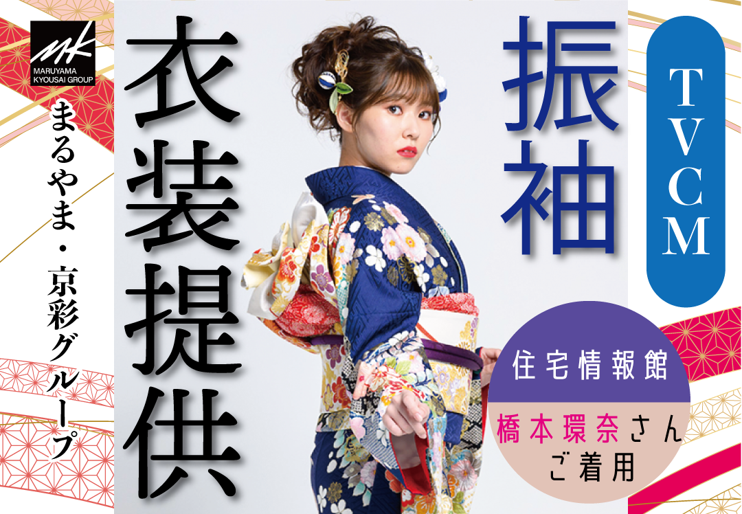 まるやま・京彩グループは、「住宅情報館」の2023年初詣時期のテレビCM『住宅情報館 2023年 初詣編』に、当グループオリジナル振袖を衣装提供いたしました。CMでは振袖を女優・タレントとして大活躍の橋本環奈さんがご着用されています。