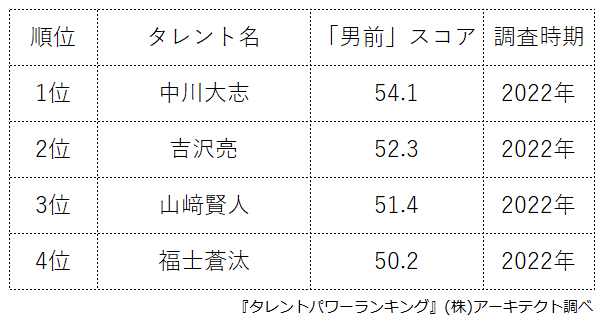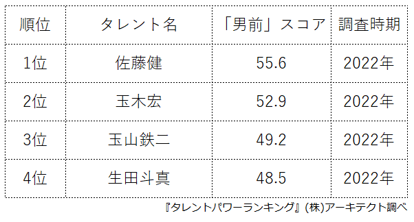 『タレントパワーランキング』では、タレントパワーランキングに登録されている「男前な」イメージを持たれている、朝ドラに出演したことがある俳優のスコアを調査。