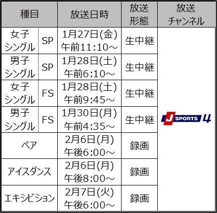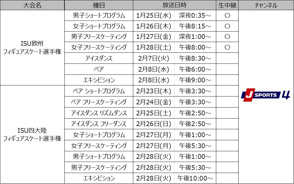 国内最大4 チャンネルのスポーツテレビ局、株式会社ジェイ・スポーツ(本社 東京都江東区、代表取締役社長 長谷 一郎、以下「J SPORTS」 ※1)は、1月23日から開催される全米フィギュアスケート選手権(以下「全米選手権」)を皮切りにISU(国際スケート連盟)主催の欧州フィギュアスケート選手権、四大陸フィギュアスケート選手権、世界ジュニアフィギュアスケート選手権、世界フィギュアスケート選手権を全種目放送します。また、PC、スマホ、タブレットで見られる 「J SPORTSオンデマンド 」 ※2 では全米選手権の全種目・全滑走をLIVE配信します。