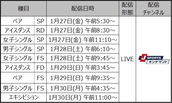 J SPORTSでは男女シングル、ペア、アイスダンス、エキシビションまで全種目放送!さらにJ SPORTSオンデマンドでは全種目・全滑走をLIVE配信!